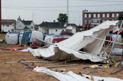 Widespread power outages, downed trees and structural damage were reported throughout Mercer and Auglaize counties on Friday after winds estimated at 80 mph ripped through the area. Winds leveled tents for this weekend's Freedom Days and brought down several large trees at the Mercer County Fairground. One tree struck several vehicles and campers. Large sections of the roof above the fairgrounds' grandstand were also ripped off. No serious injuries were reported. Freedom Days' planners hope to get things up and going by noon Saturday. Friday's activities at the community picnic in St. Henry were derailed when several tents were blown down, but the festivities should go on Saturday and Sunday. A large section of the roof of the state garage on state Route 29 west of Celina peeled off.