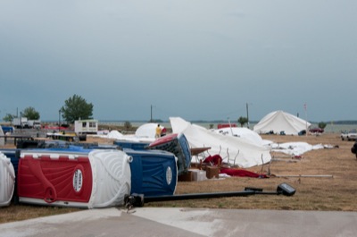 Widespread power outages, downed trees and structural damage were reported throughout Mercer and Auglaize counties on Friday after winds estimated at 80 mph ripped through the area. Winds leveled tents for this weekend's Freedom Days and brought down several large trees at the Mercer County Fairground. One tree struck several vehicles and campers. Large sections of the roof above the fairgrounds' grandstand were also ripped off. No serious injuries were reported. Freedom Days' planners hope to get things up and going by noon Saturday. Friday's activities at the community picnic in St. Henry were derailed when several tents were blown down, but the festivities should go on Saturday and Sunday. A large section of the roof of the state garage on state Route 29 west of Celina peeled off.