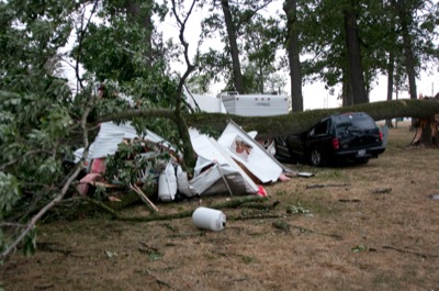 Widespread power outages, downed trees and structural damage were reported throughout Mercer and Auglaize counties on Friday after winds estimated at 80 mph ripped through the area. Winds leveled tents for this weekend's Freedom Days and brought down several large trees at the Mercer County Fairground. One tree struck several vehicles and campers. Large sections of the roof above the fairgrounds' grandstand were also ripped off. No serious injuries were reported. Freedom Days' planners hope to get things up and going by noon Saturday. Friday's activities at the community picnic in St. Henry were derailed when several tents were blown down, but the festivities should go on Saturday and Sunday. A large section of the roof of the state garage on state Route 29 west of Celina peeled off.