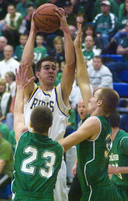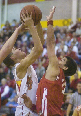DELPHOS - Two teams accustomed to pounding each other on the gridiron did it instead on the hardwood Friday night when The Marion Local Flyers traveled to the Vatican to take on the St. John's Blue Jays.