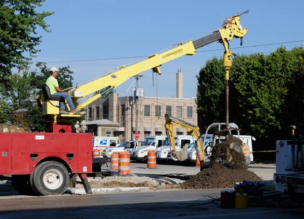 Extra large holes are dug at the intersections to support the traffic lights. Here the dirt is shaken off the auger.