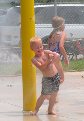 | A little boy hams it up in front of one of the new sprinklers installed this spring at the Coldwater Memorial Park swimming pool. Purchase this as a quality photograph | ||||||||