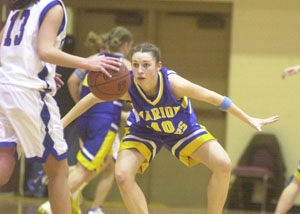 | Marion Local's Katelyn Mescher, 40, gets in a defensive stance as a Franklin-Monroe player brings the ball up the floor during their Division IV regional semifinal contest. Purchase this as a quality photograph | ||||||||