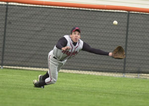 | New Knoxville's Garret Rohr dives for a flyball during Sunday's Division IV sectional action at Minster. Marion Local (9-6 over New Knoxville) and New Bremen (11-1 over Waynesfield-Goshen) each won their semifinal contests and advance to the sectional finals. Purchase this as a quality photograph | ||||||||