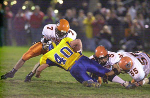 But sometimes, he does some things that just forces the spotlight to direct its beam on that #25 jersey. In a span of nine minutes and 20 seconds, Homan rushed for 159 yards and three touchdowns, helping the Cavaliers pull away and post a 35-21 win over St. John's in the regular-season finale at Stadium Park in Delphos. The Cavaliers, the top team in Division IV according to the Associated Press state poll, completed a second straight 10-0 regular season and a second straight Midwest Athletic Conference title at 8-0 -- the third in four seasons for both accomplishments -- and the chance to host a first-round playoff game. The Cavaliers will open the postseason on Saturday against Elyria Catholic starting at 7 p.m. at Cavalier Stadium. The Blue Jays, looking to beat the Cavaliers for a share of the MAC title, end the season at 8-2 overall and 6-2 in the MAC and will travel to Covington on Saturday to face the Buccs in a Division VI regional quarterfinal. Homan's play in the game, both on offense and on defense, was the spark Coldwater needed to get past St. John's. Coldwater coach John Reed had praise for his two-time All-Ohio standout, but was quick to note that Homan is just a part of the team. "He's an amazing young man more than he is a player," said Reed. "But if you were to ask him, he would tell you that he's a part of a team. He has great skill, no question about that, but his teammates allow him to do the things that he does. "If our offensive line wasn't playing the way they were playing. If Steve Borger wasn't as diversified throwing the ball. If we didn't have the great receivers. We're constantly selling a team game and Ross Homan believes in what we're selling." St. John's coach Todd Schulte' comment about Homan was short and to the point. "He's all over the field," said Schulte of Homan. "He's a man. All the recognition he gets, he deserves." The Blue Jays kept the Cavaliers defense off-balance in the first half with a wicked option attack. St. John's quarterback Nick Johnson had 105 of his 139 yards in the first half, scoring both first-half touchdowns from 42 and 28 yards out. Andrew DeWitt, the MAC's top rusher, finished with 65 yards. "When you don't see it all year, it took them a little by surprise, I think," said Schulte. "I'm sure they worked very hard at it. ... We executed very well in the first half." The two teams played even through the first half. St. John's would score to go up, only to have the Cavaliers come back to tie the game. Coldwater took the kickoff to start the second half. Homan dashed 59 yards on the return to give the Cavaliers first down at the Blue Jay 21. After backup runner Tony Harlamert ran for four yards while Homan took a rest on the sidelines, Steve Borger found Homan for two passes for eight yards to get to the nine. Homan then took the draw and barreled up the middle for the final nine yards to put Coldwater up 21-14 after Trevor Stromblad's PAT kick. "The big kickoff return to start the second half took the wind out of our sails," said Schulte. "They've got a lot of athletes and they made a lot of plays tonight. They deserve to be the MAC champions. "You watch them on tape and you see big play after big play. That's why they're 10-0 in our league, and that's hard to do," pointed out Schulte. After the Blue Jays' next drive faltered at the Coldwater 40 and the punt by Mike Grubenhoff went just 12 yards, Coldwater struck again. Homan's first two carries went 31 yards and Harlamert ran the next play before Borger found Brady Geier for two straight passes. Homan came back to rush for 12 yards to get to the 16, then ran in the final 16 to make it 28-14 with 3:53. St. John's went three-and-out and caught a break when an illegal block to the back was called on Coldwater, putting the Cavs at their own nine. Homan promptly went to the right, caught a few blocks and cranked up the afterburners to make the 91 yards in just 14 seconds for the final Coldwater score. Homan finished with 204 yards rushing -- putting him over the 1,000-yard mark on the season -- and four touchdowns. Of the 227 rushing yards the Cavaliers had in the game, 195 came in the second half. "I really thought our offensive line was the difference in the second half," said Reed. "I don't know when we scored those points (third quarter), but the line deserves the credit. We came out and wanted to see if we could run the ball on them." Borger continued to be the most efficient quarterback in the area, going 12-of-16 for 143 yards. With Brady Geier doubled-teamed most of the night, Borger shared the wealth by throwing to seven different receivers. Tight end Gaston Pleiman had three catches for 47 yards and Ryan Geier added two catches for 37 yards. "When they doubled Brady, that means somebody else is going to be open," said Reed. "Steve's good enough to be able to do that." |