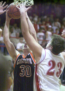 Coldwater's Gaston Pleiman, 30, and St. Henry's Mitch Niekamp, 23, fight for a rebound during their game on Friday night.