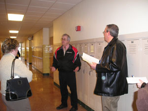 McBroom Junior High School Principal Newt Triplett, center, explains the school's 548 lockers need a coat or two of paint. Listening were board of education members Lisa Tobin, left, and Craig Gottschalk.