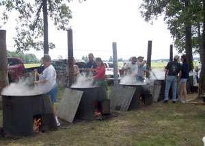 | | The 108th annual Durbin Bean Bake on Labor Day was a success. The event originated in 1898 in Durbin to honor Civil War veterans. Now, children's games, magic and pedal tractor pulling complete a long day of bean pot stirring. The Pfenning brothers, friends and family all pitch in to make the event work. According to the Pfennings, water is heated to a rolling boil and the meat is added to the pot for about an hour. Then beans are poured in and the stirring begins. Stirring must be constant or the beans will stick, ruining the pot. A secret seasoning is added during the stirring. The beans aren't ready until they are scooped from the pots, allowed to cool and the flag, honoring the veterans, is retired. | |