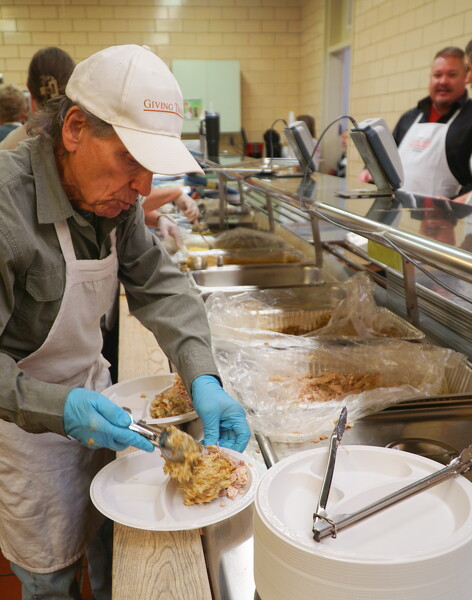 Volunteer Wally Ellinger adds a scoop of dressing to a plate at the annual Giving Thanks community dinner at Celina High School.