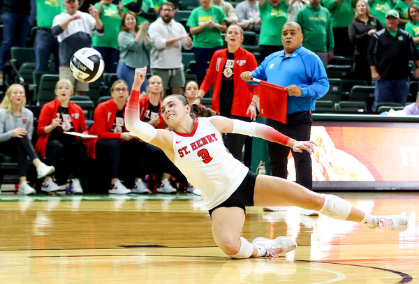 St. Henry's Morgan Baumer hits the floor to keep the ball from hitting the floor during Saturday's match with Newark Catholic.