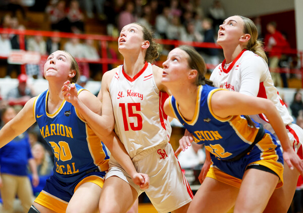 St. Henry's Karlee Buschur (15) fights for a rebound with Marion Local's Kiley Schoenlein (30) and Mya Eckstein (22).