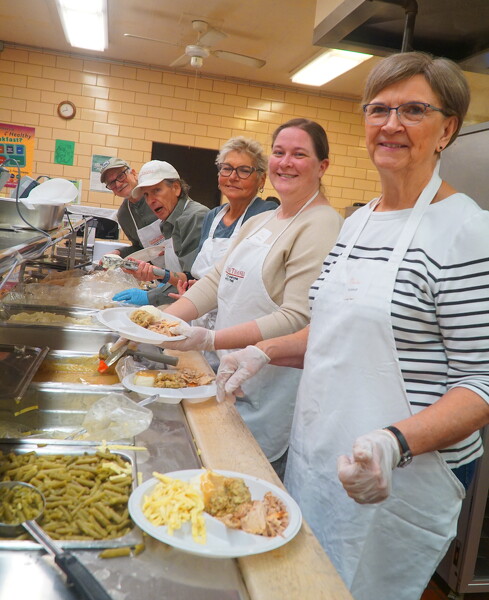 Assembling plates of turkey, dressing, green beans, noodles, and mashed potatoes and gravy for hungry diners at the annual Giving Thanks dinner in Celina are, from front, volunteers Rita Schmit, Amber Mustard, Judy Sherrill, Wally Ellinger and Brian Engle.
