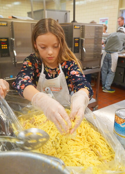Volunteer Lydia Driggs seasons the noodles in the kitchen for the annual Giving Thanks community dinner at Celina High School.