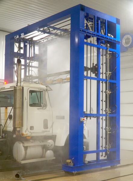 "This is a custom piece of equipment. There's only a few that exist," Grey said, pointing to sensors which detail a vehicle's profile to ensure precise cleaning of its contours. "The full machine runs on tracks and it will profile the truck."