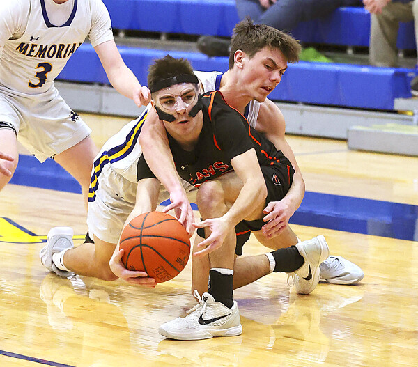 St. Marys' Aiden Meinerding, back, tries to get the ball away from Coldwater's Nolan Mescher during Saturday's game at Grand Lake Health System Court.